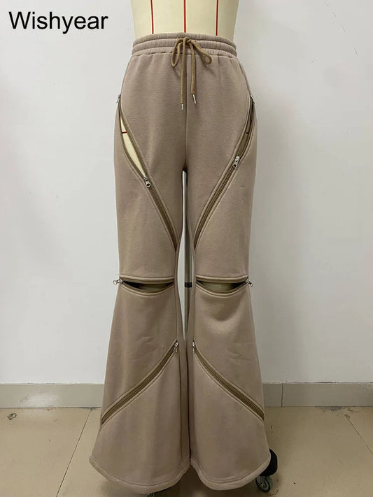 Fashion Brown Cargo Wide Leg Pants Women Vintage Multi Zip Design Drawstring Loose Sporty Sweatpants Trousers Boyfriend Female