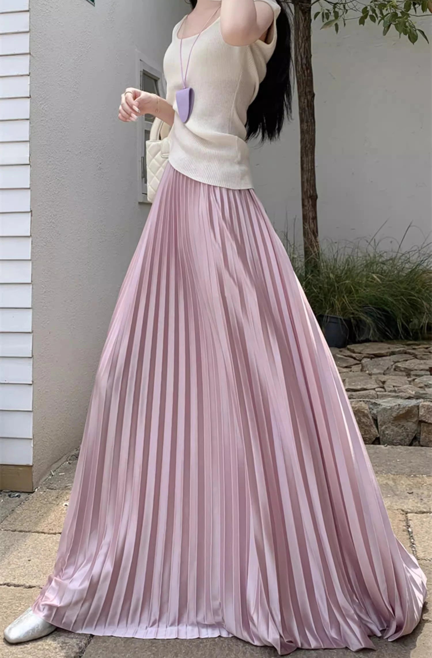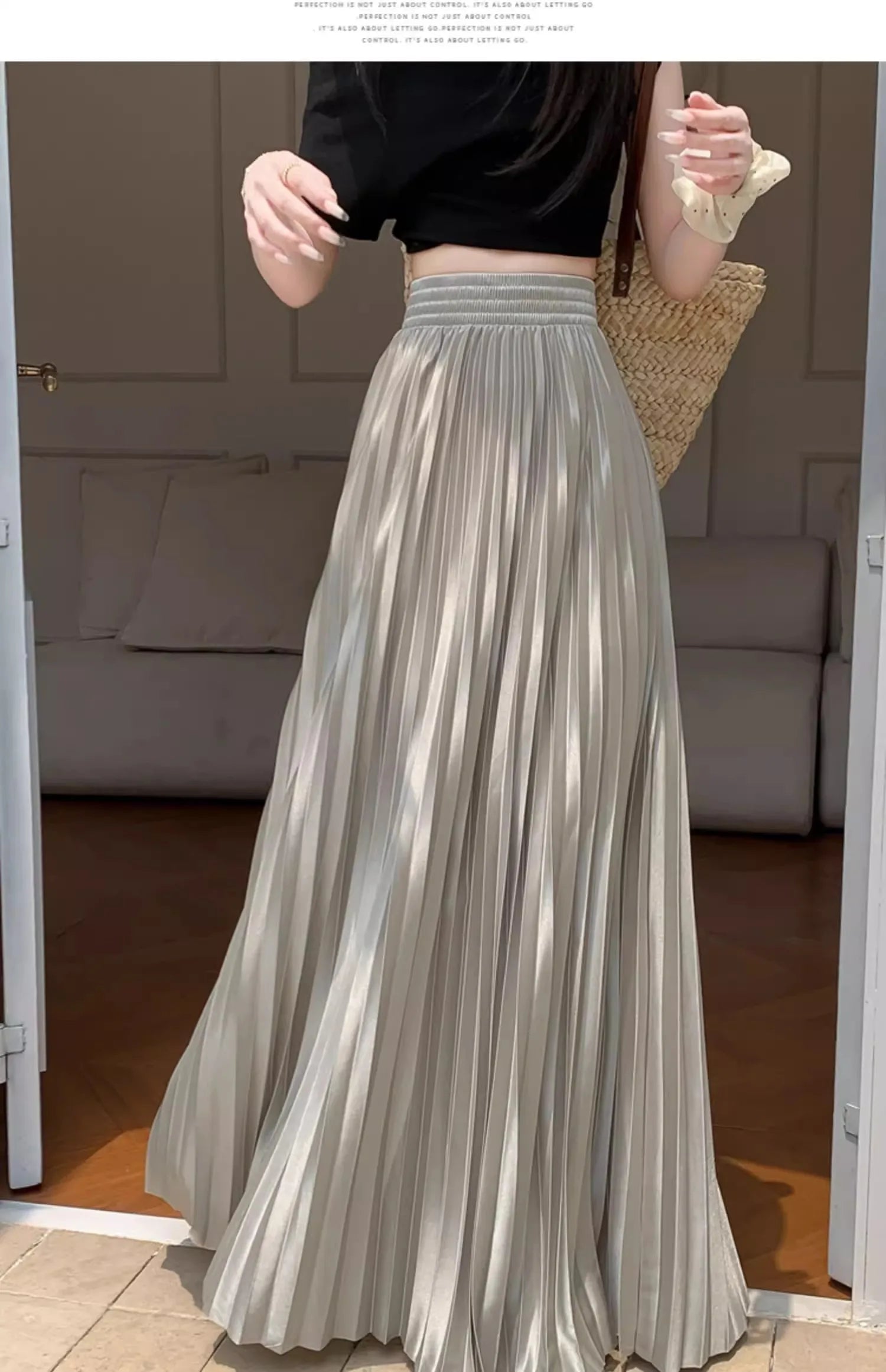 98cm Basics Maxi Pleated Skirt for Women New Korean Casual All-match Solid A Line High Waist Long Maxi Skirt Female