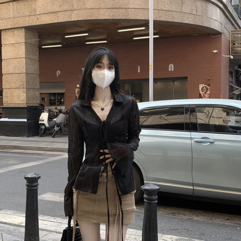 Gidyq Women Streetwear Shirts Fashion Lace Up Long Sleeve Blouse Korean Y2K Casual Female Loose Sun Protection Shirts Spring New